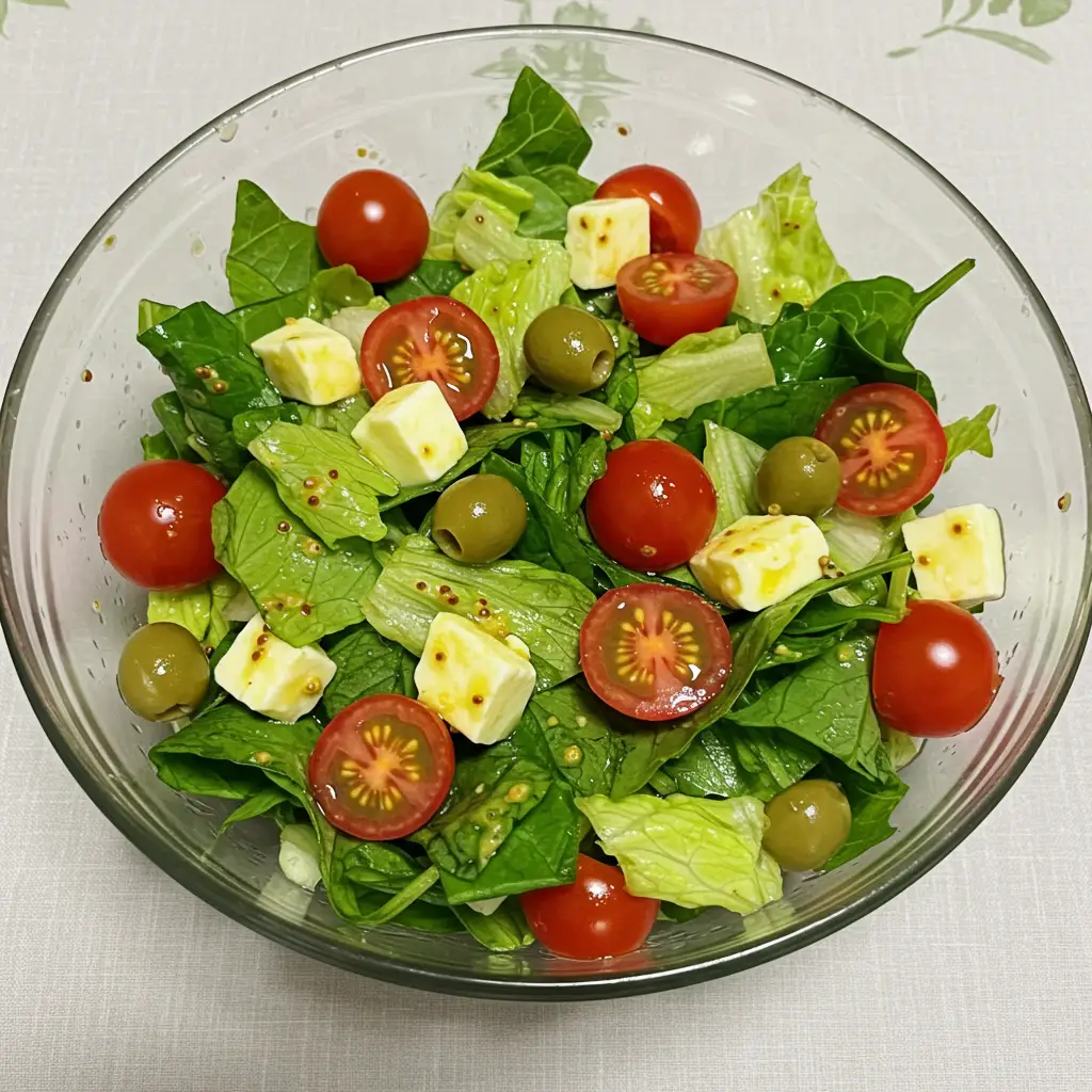 Uma combinação refrescante de folhas verdes, tomates e queijo, acompanhada de um irresistível molho de mostarda que traz um toque de sabor e leveza à sua refeição.