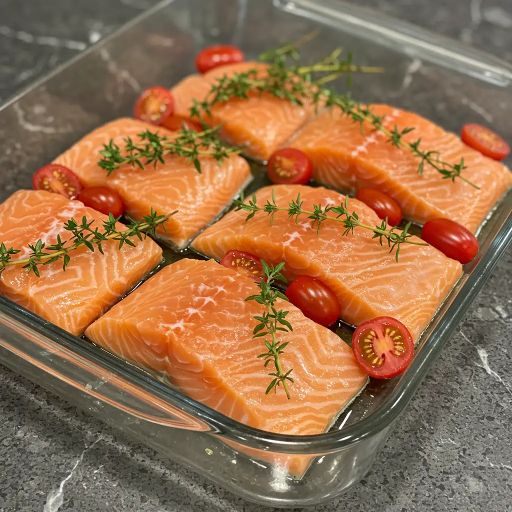 Filés de salmão suculentos, perfumados com tomilho fresco e finalizados com tomates cereja. Uma explosão de sabor em cada garfada! Ideal para um jantar romântico ou uma ocasião especial.