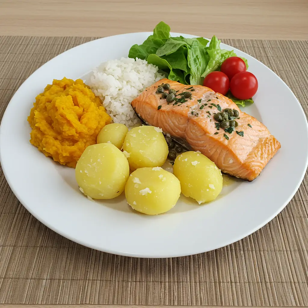 Sirva o salmão com as batatas assadas, acompanhado de salada, arroz e creme de abóbora (opcional).