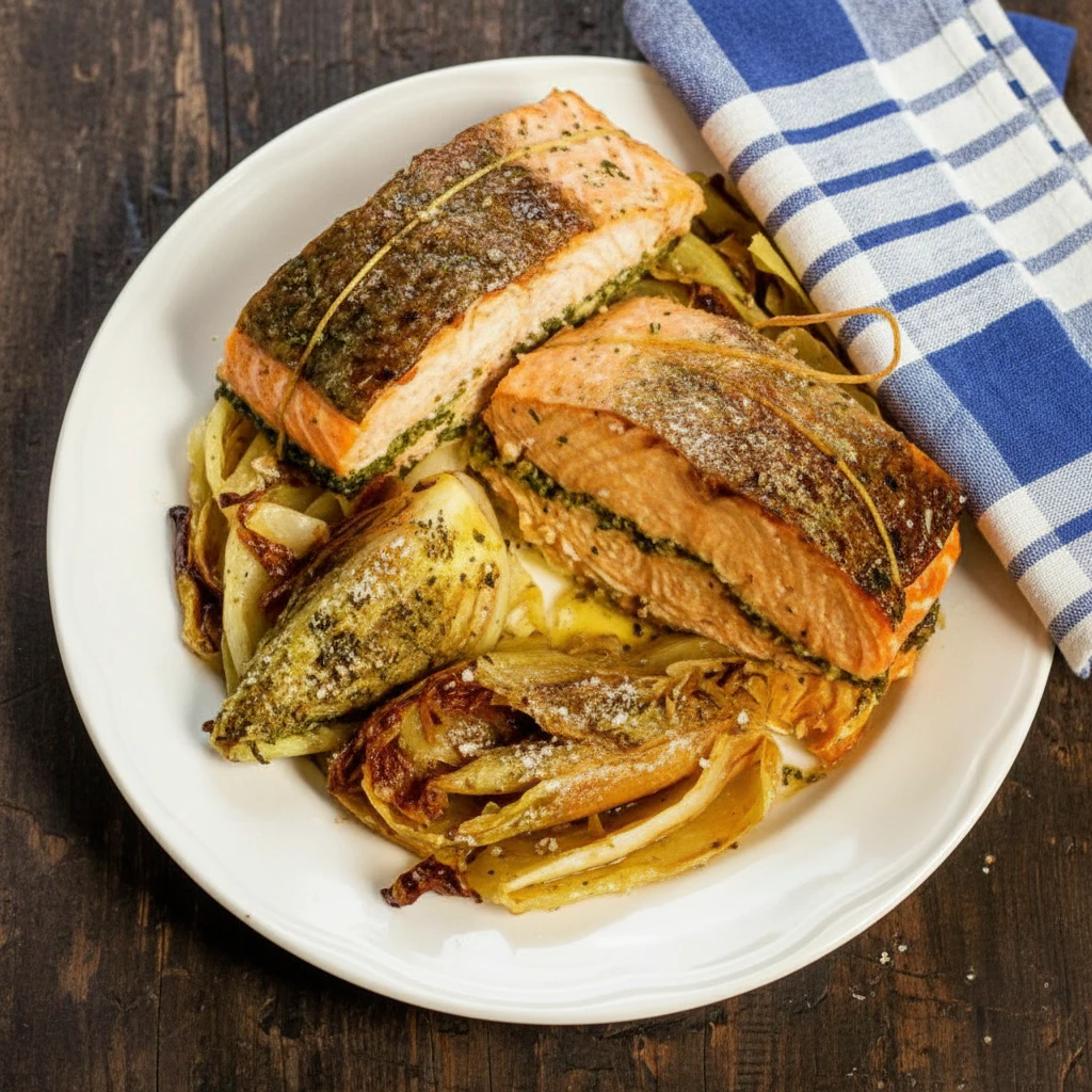 Delicioso salmão assado com uma crosta aromática de ervas frescas, nozes e pecorino romano. Uma receita fácil e sofisticada para uma refeição inesquecível.