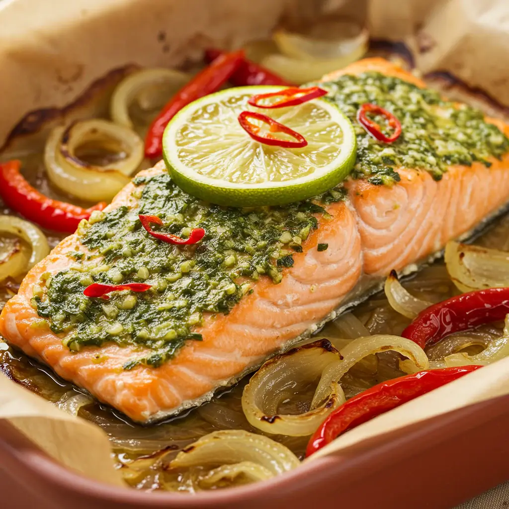Salmão assado em papel alumínio com manjericão e azeitonas