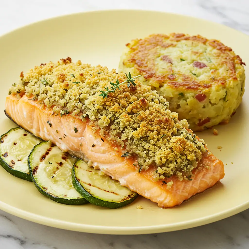 Salmão Crocante com Crosta de Ervas, Legumes Grelhados e Bolinhos de Batata com Bacon