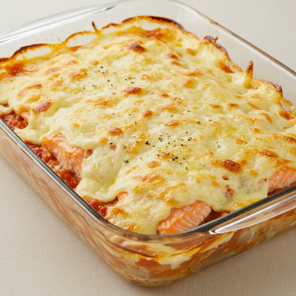 Despeje o purê de batata sobre o salmão e o molho de tomate.