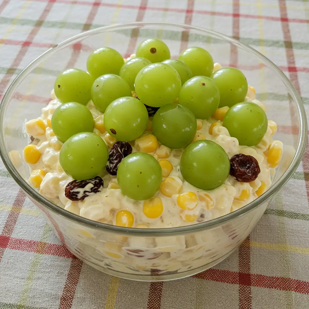 Em uma bacia grande, misture o repolho, as maçãs, as uvas verdes, o presunto, as uvas passas, o milho, as ervilhas e o frango desfiado.