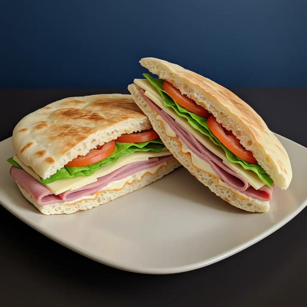 Um sanduíche rápido e saboroso, perfeito para um lanche prático e delicioso. O pão sírio macio envolve o sabor do presunto, queijo e tomate, finalizado com um toque de orégano.