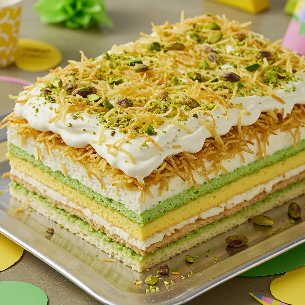 Retire o sanduíche da geladeira, retire o pano e cubra com a mistura de requeijão e creme de leite. Decore com batata palha e pistache.