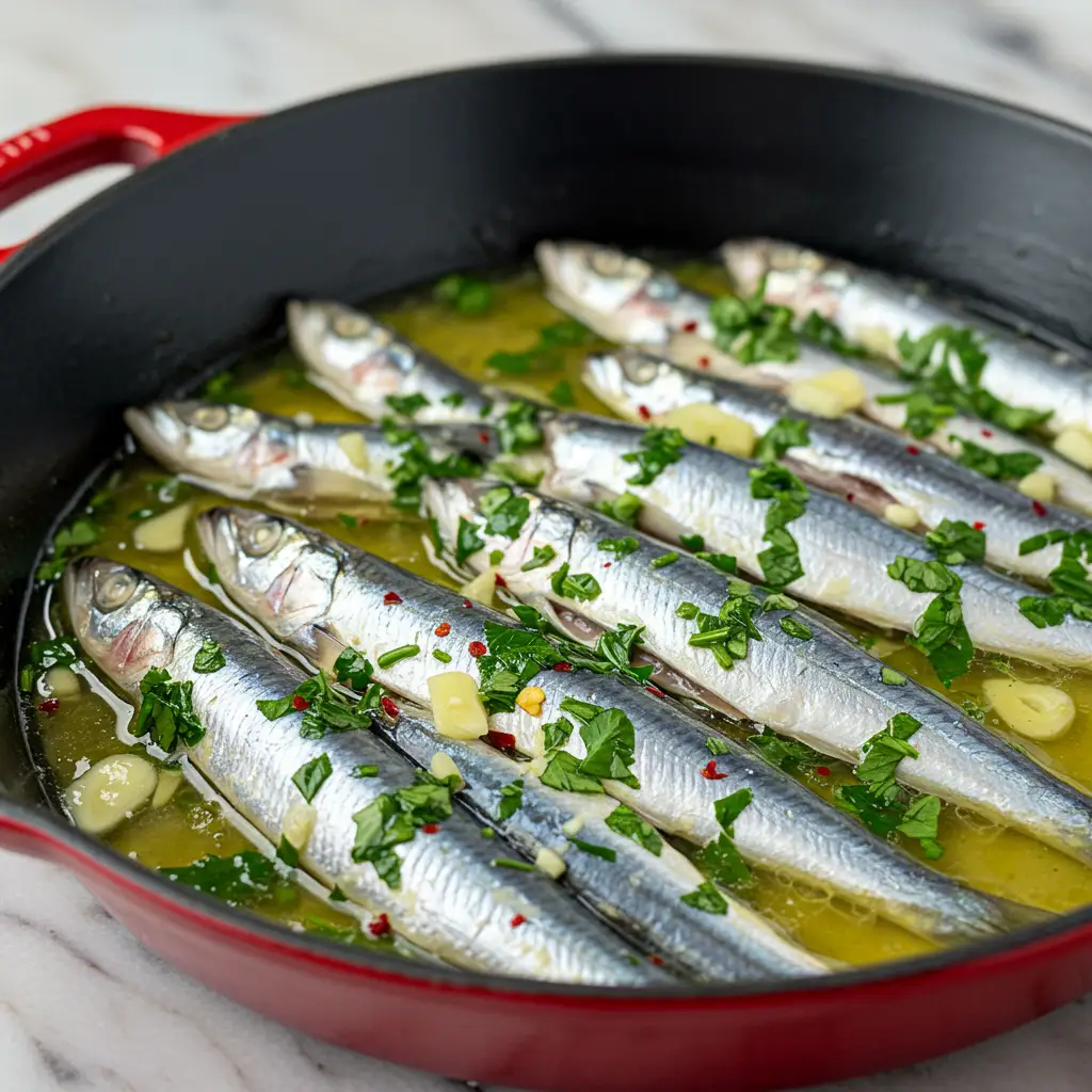 Deliciosas sardinhas marinadas em vinho branco, vinagre e limão siciliano, temperadas com alho, pimenta e salsinha. Um prato saboroso e fácil de preparar, perfeito para um jantar especial.