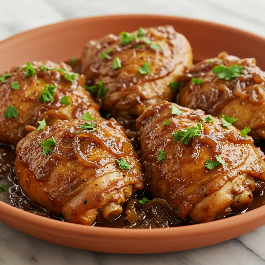 Sobrecoxas suculentas e saborosas, cozidas lentamente em um molho de cebola caramelizada. Uma receita simples e deliciosa, perfeita para um jantar em família.