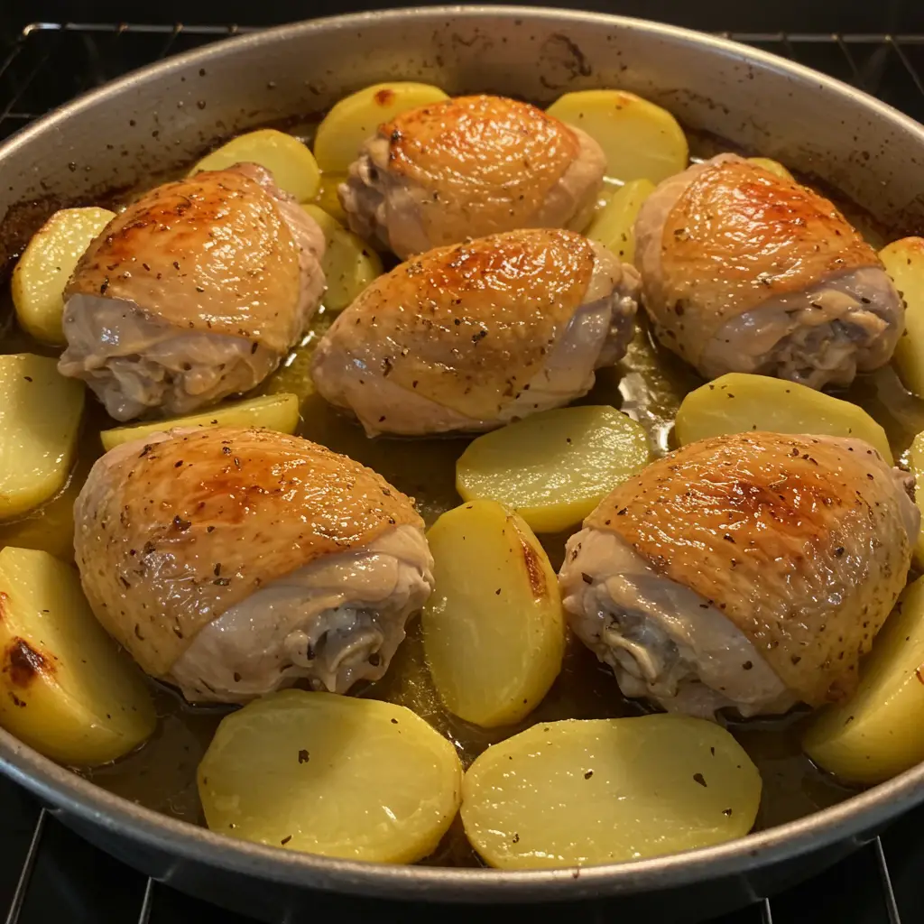 Sobrecoxas suculentas e saborosas assadas com batatas macias, temperadas com ervas frescas e um toque de cebola e caldo de galinha. Uma receita simples e deliciosa para o dia a dia.