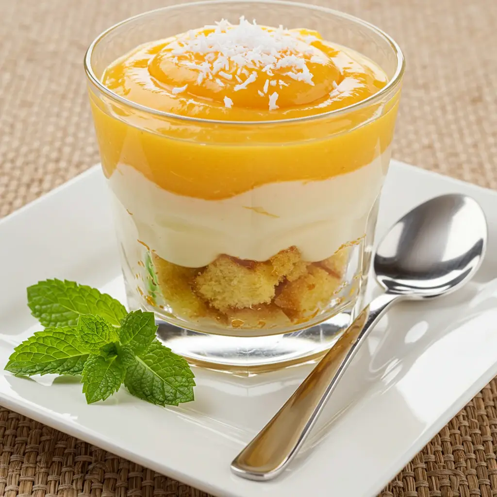 Uma explosão de sabores tropicais! Camadas de bolo de abacaxi macio, cocada cremosa de maracujá e sorvete de coco com abacaxi formam uma sobremesa irresistível, perfeita para um dia quente.