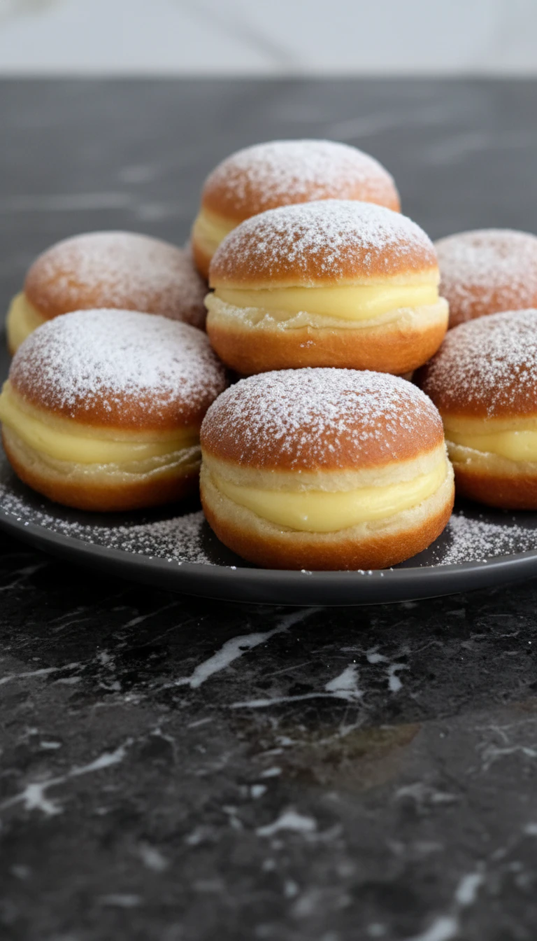 Corte os sonhos ao meio, recheie com o creme e polvilhe com açúcar de confeiteiro.
