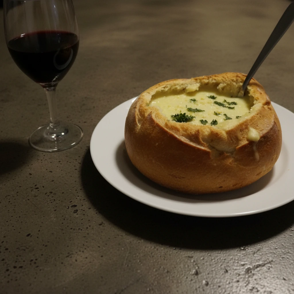 Uma sopa cremosa e saborosa, com palmito e queijo gratinado, servida em um pão italiano. Uma experiência gastronômica única e aconchegante, perfeita para um jantar especial.