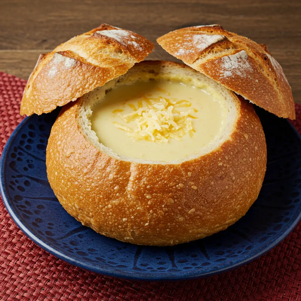 Sopa cremosa de queijos em pão italiano