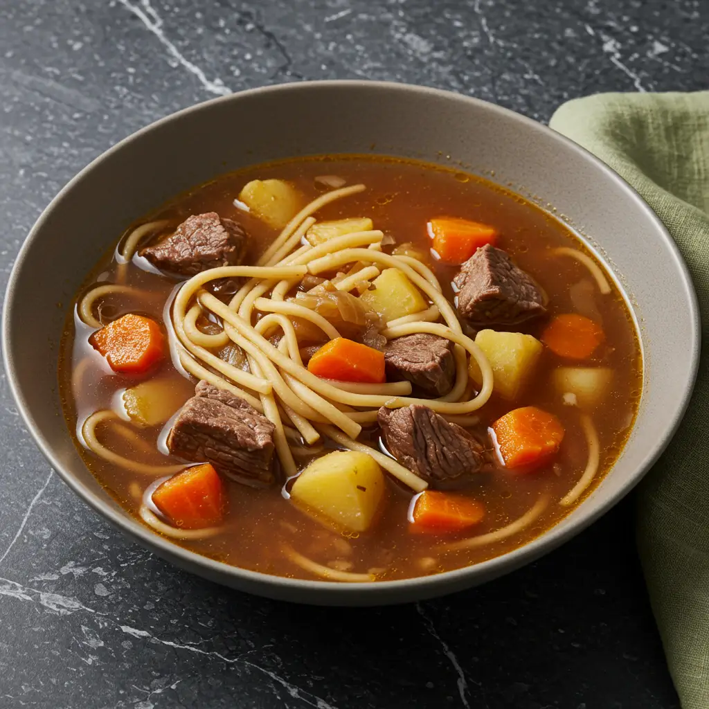 Uma sopa reconfortante e saborosa, perfeita para um dia frio. A carne macia se mistura com legumes frescos e macarrão, criando um prato completo e nutritivo. Ideal para um almoço em família!