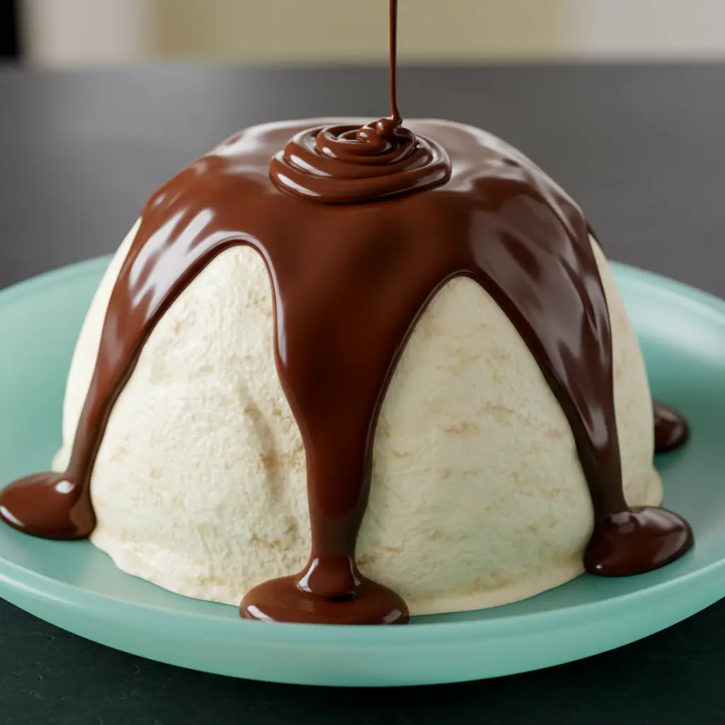 Em uma forma para sorvete, espalhe a calda de chocolate. Em seguida, adicione o creme preparado.