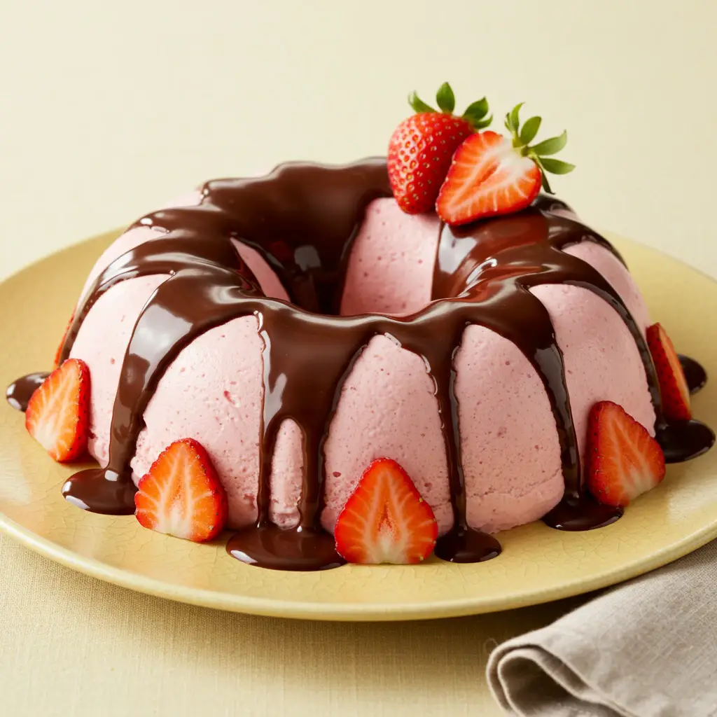 Um sorvete cremoso de morango, feito com ingredientes frescos e simples, coberto por uma irresistível calda de chocolate quente. Perfeito para um dia quente ou uma sobremesa especial!