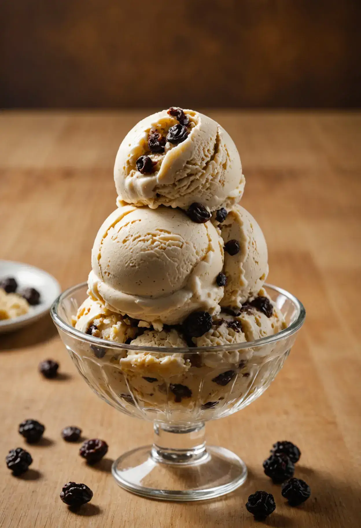 Um sorvete irresistivelmente cremoso, com passas suculentas embebidas em rum, ideal para uma sobremesa sofisticada.