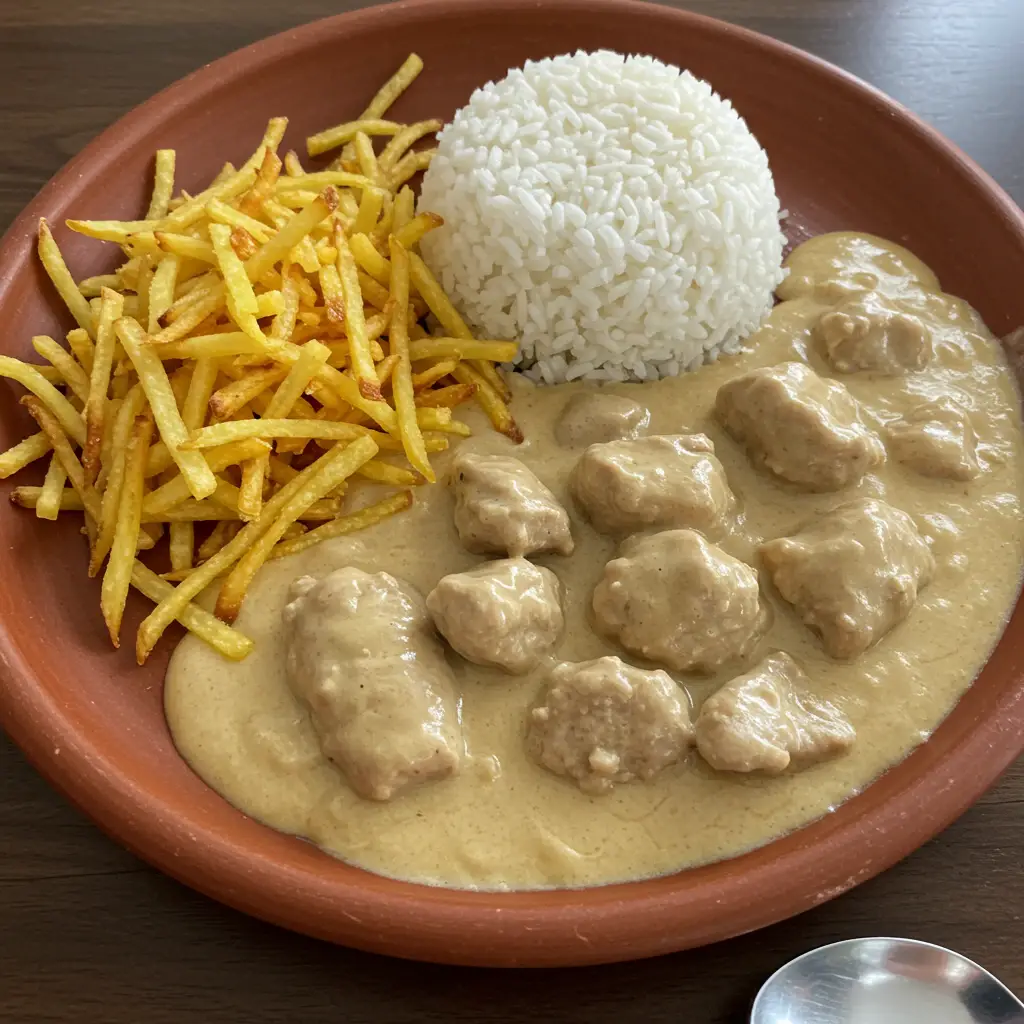Um strogonoff de frango cremoso e saboroso, com um toque especial de cogumelos e milho. Prato prático e delicioso para o dia a dia, perfeito para toda a família!