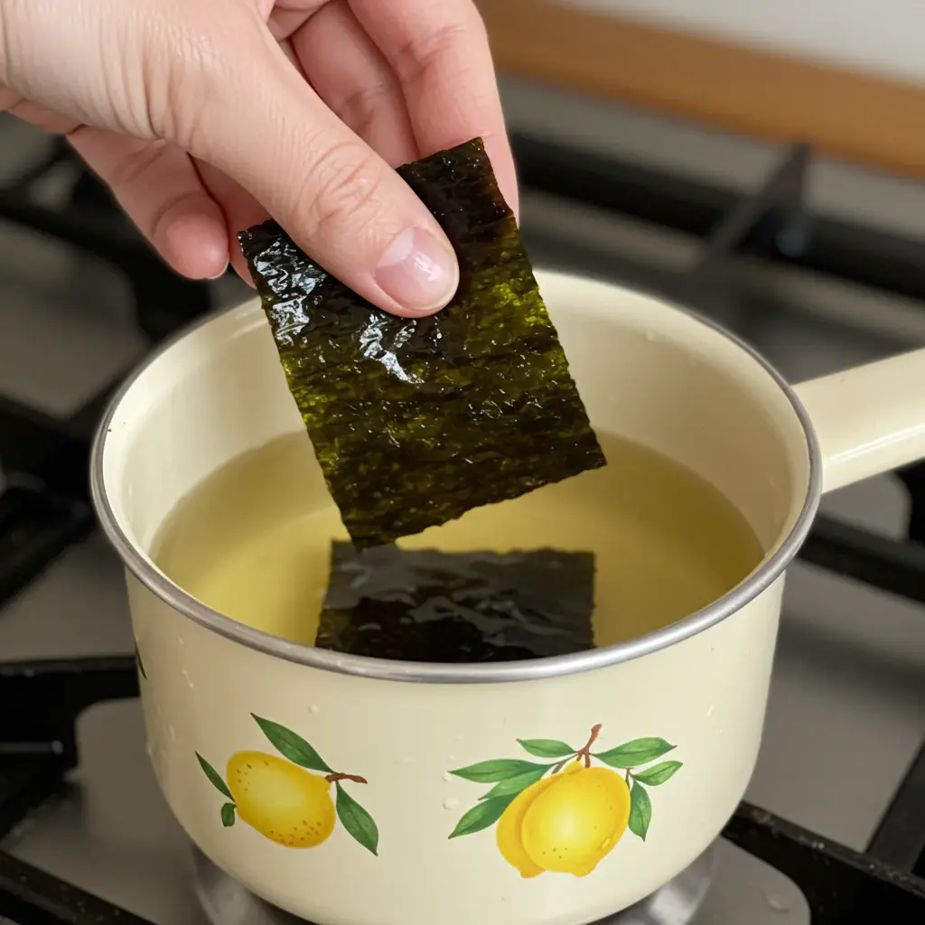 Em uma panela pequena, misture o vinagre de arroz, o açúcar, o sal, o sake mirim e o kombu.