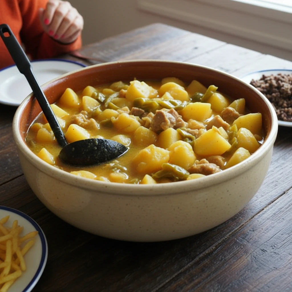 Em uma panela, aqueça o azeite e refogue a cebola, os pimentões, o tomate e a batata até que estejam macios.