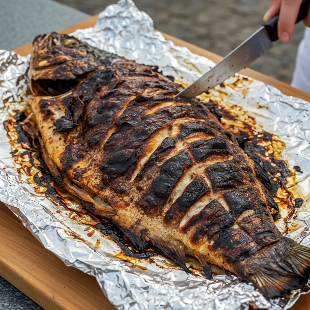 Retire o tambaqui da churrasqueira com cuidado, remova o papel alumínio e sirva.