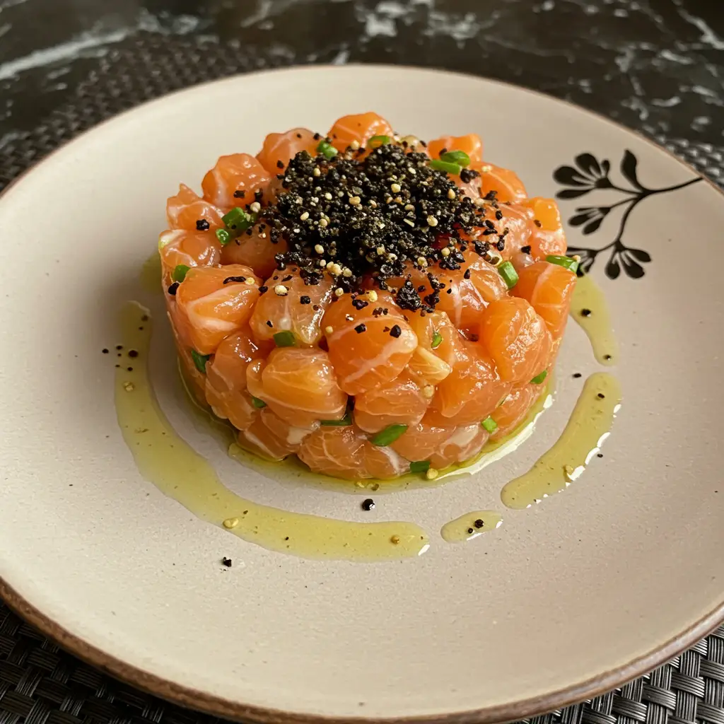 Um tartar de salmão sofisticado e saboroso, com um toque oriental. O salmão fresco é realçado por um molho agridoce e crocante, perfeito para uma entrada elegante.