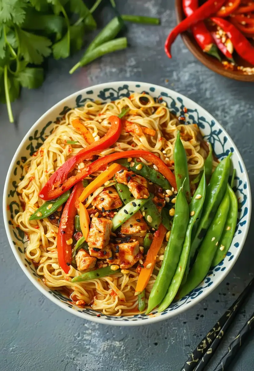 Adicione o pimentão vermelho, a cenoura e as ervilhas-tortas à frigideira. Refogue por 3-4 minutos até que os vegetais estejam crocantes e macios.