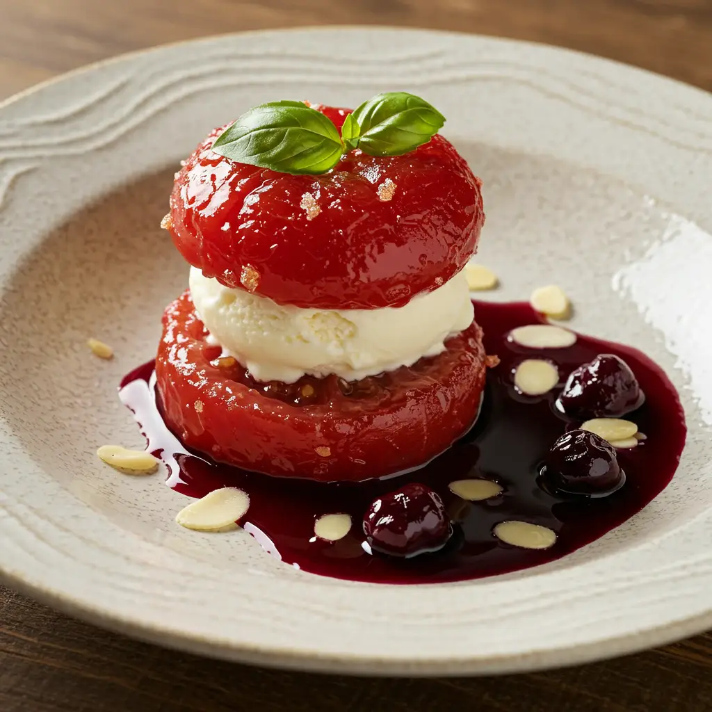 Deliciosos tomates cristalizados, com um toque sutil de cravo-da-índia, servidos com uma bola de sorvete de creme. Uma sobremesa sofisticada e refrescante, perfeita para um final de tarde especial.