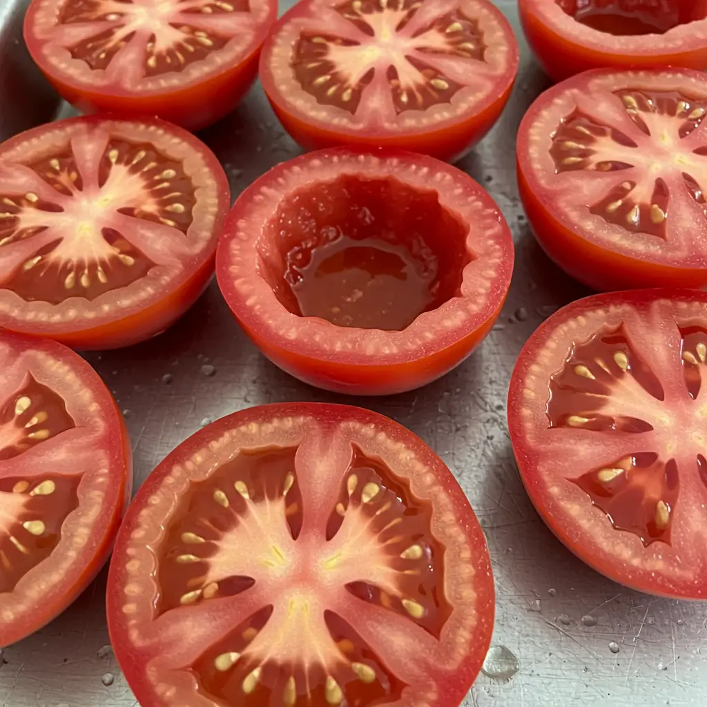 Lave bem os tomates, corte-os ao meio e retire as sementes.