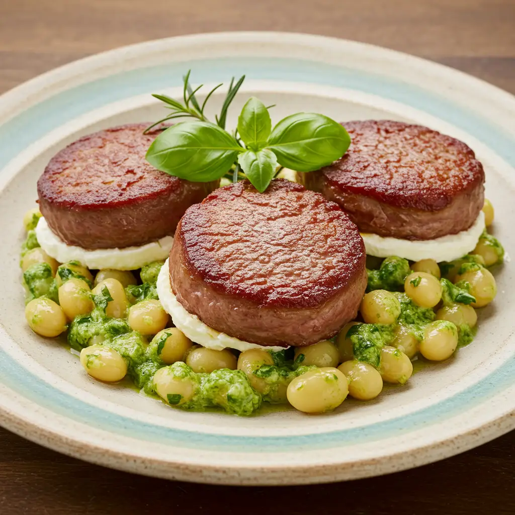 Uma torre de sabores intensos! Medalhões de filé mignon suculentos, contrastando com o sabor terroso dos shitakes e o toque cremoso da mussarela de búfala, finalizado com um vinagrete de ervas frescas.