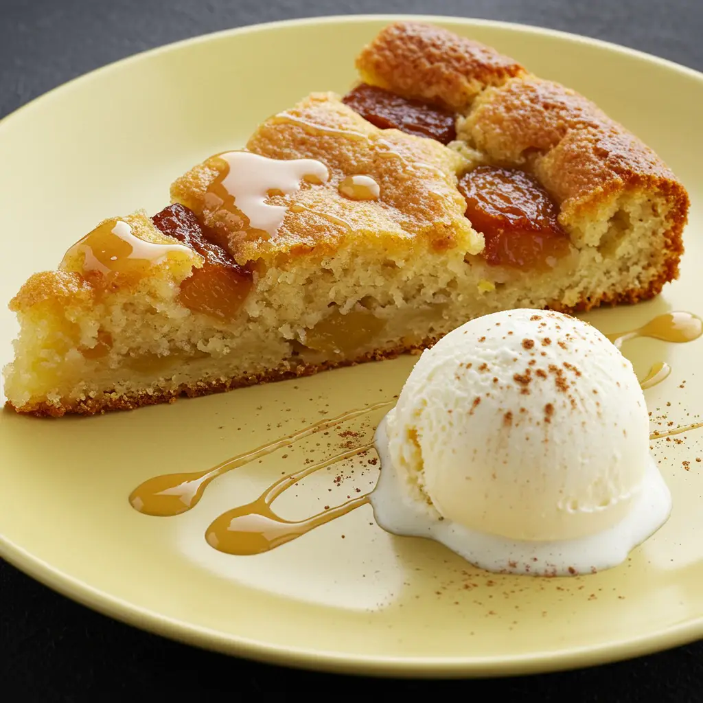 Sirva a torta acompanhada de sorvete de creme, polvilhado com canela e fios de leite condensado.