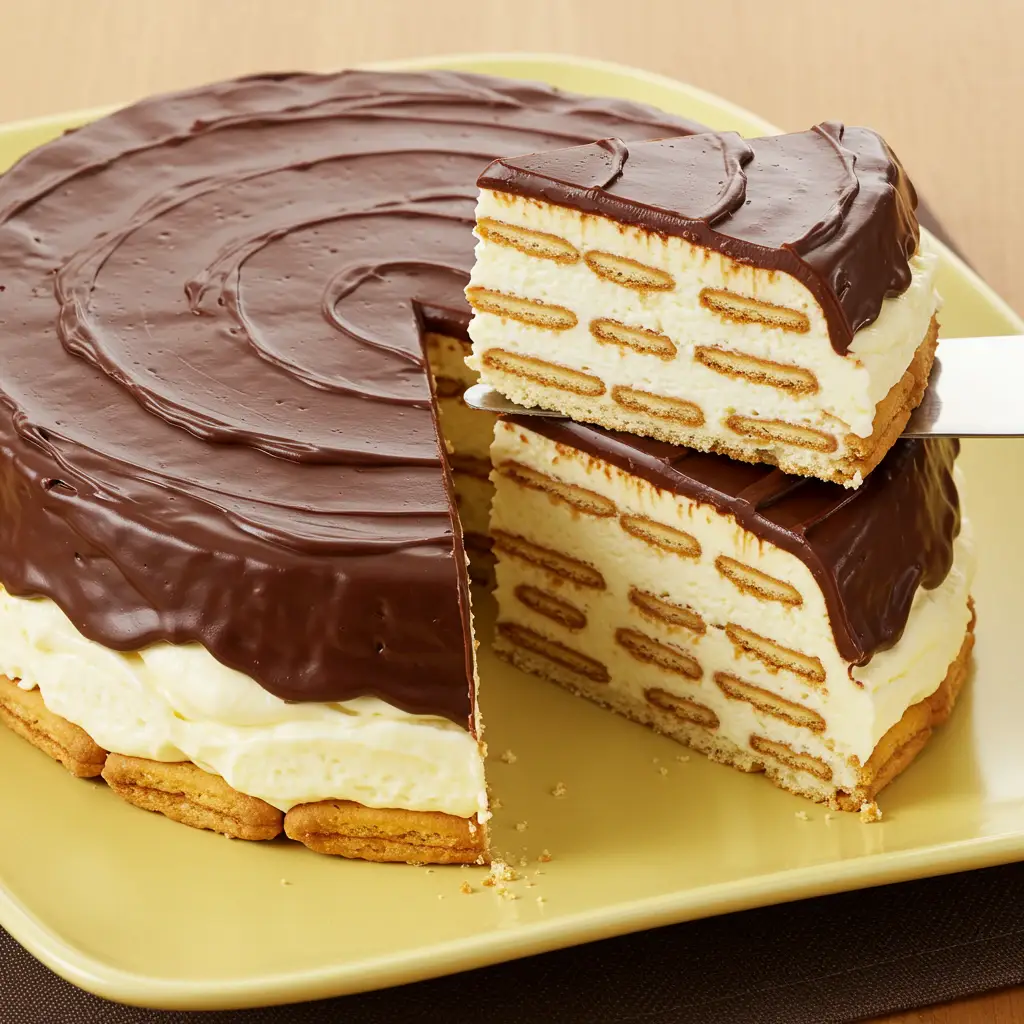 Uma torta deliciosa e fácil de preparar, com camadas de biscoito amanteigado e um cremoso recheio de baunilha, finalizada com uma irresistível cobertura de chocolate. Perfeita para um lanche da tarde ou sobremesa especial.
