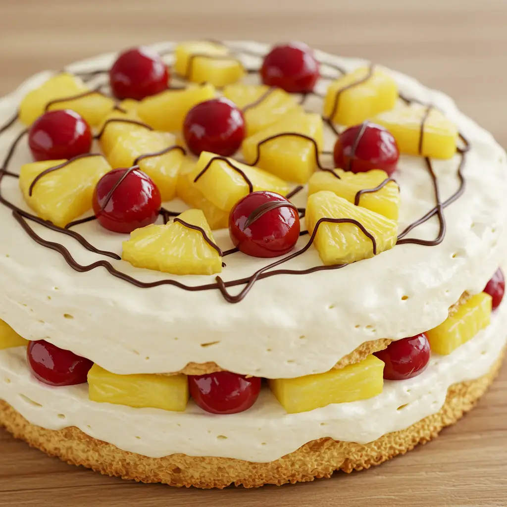 Decore com fatias de abacaxi, cerejas e chocolate branco ralado.