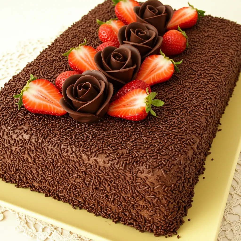 Uma torta irresistível! Massa fofinha e úmida, recheada com um cremoso brigadeiro de chocolate meio amargo e finalizada com morangos frescos. Uma explosão de sabores que vai te conquistar!