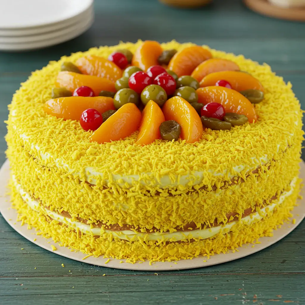 Deliciosa torta natalina com camadas de bolo macio, recheio cremoso de leite condensado e frutas em calda, finalizada com um toque especial de marshmallow e fios de ovos. Uma sobremesa perfeita para celebrar as festas de fim de ano!