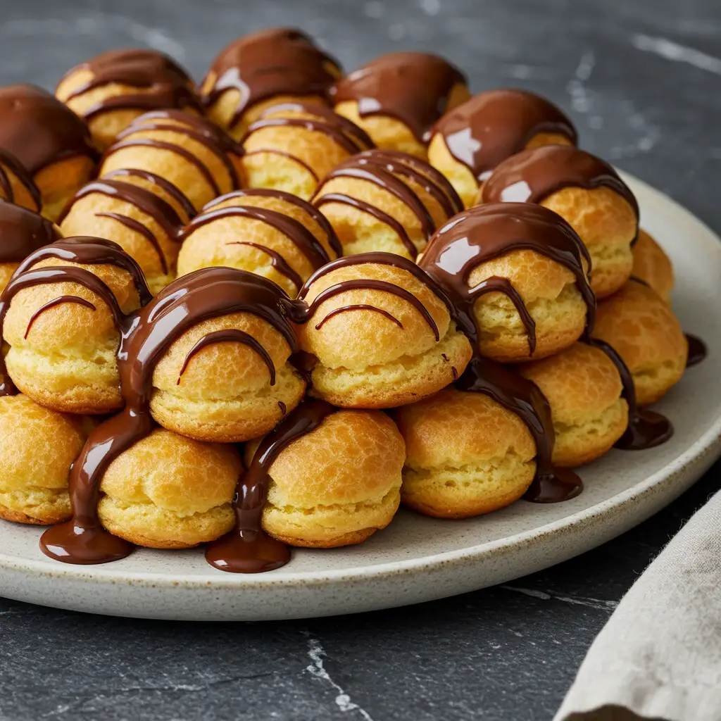 Uma torta irresistível! Delicados profiteroles crocantes recheados com um cremoso creme de chocolate, formando uma sobremesa sofisticada e perfeita para momentos especiais.
