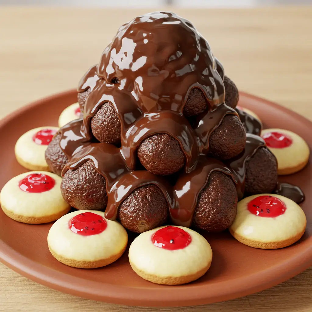 Uma torta irresistível! Base de pão-de-ló, cremoso creme confeiteiro, profiteroles crocantes e uma cobertura de ganache de chocolate derretido que te levará ao paraíso. Uma sobremesa perfeita para ocasiões especiais.