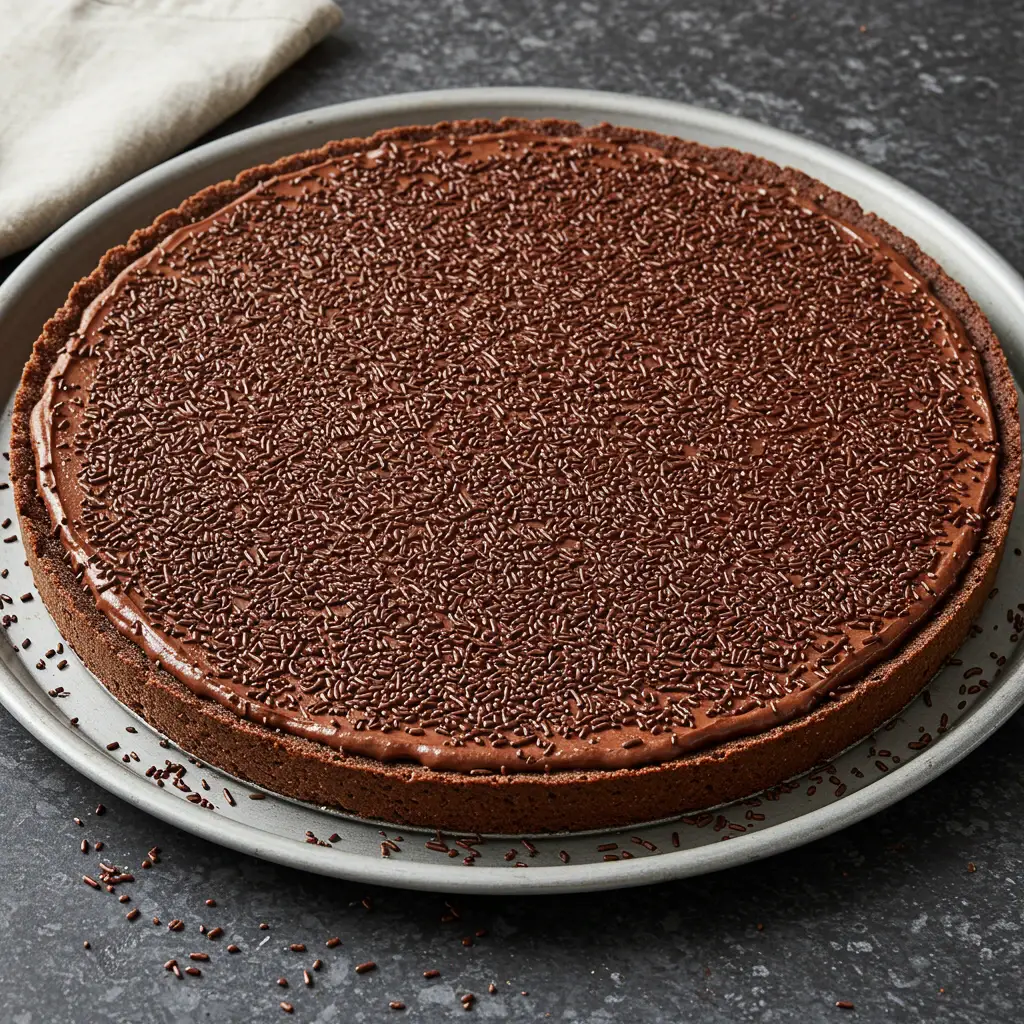 Cubra a torta com a calda de chocolate, decore com chocolate granulado e leve à geladeira por pelo menos 2 horas.