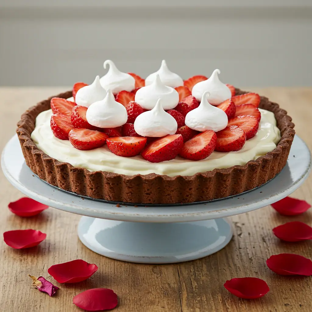 Uma torta irresistível! Base crocante de cacau, recheio cremoso de chocolate branco com morangos e licor, finalizada com suspiros deliciosos. Perfeita para momentos especiais!