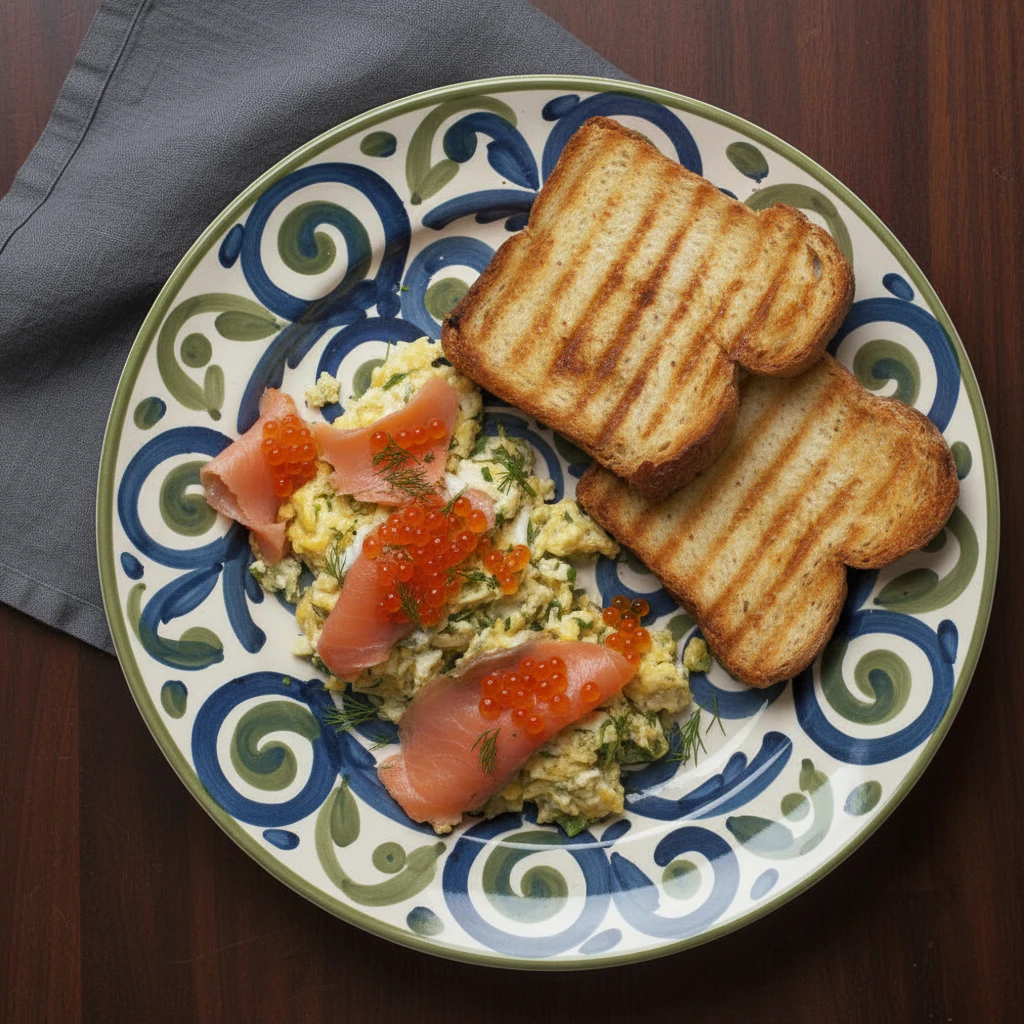 Uma entrada sofisticada e rápida! Tostas de brioche quentinhas, cobertas com um cremoso ovo mexido, salmão defumado e toque especial de ervas frescas.
