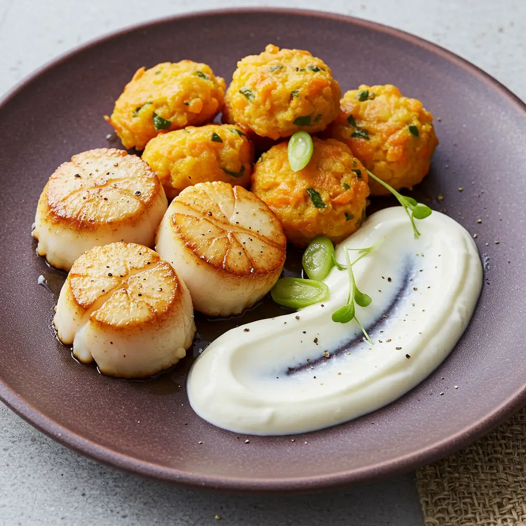 Deliciosas vieiras grelhadas, acompanhadas por leves bolinhos de cenoura e um refrescante molho de iogurte. Uma combinação perfeita de sabores e texturas para uma refeição inesquecível.