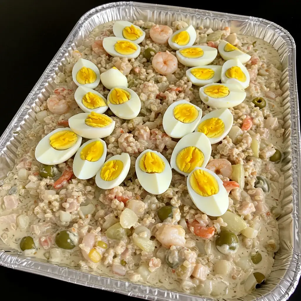 Por fim, coloque a salada de maionese sobre os camarões, pressionando levemente para compactar e nivelar.