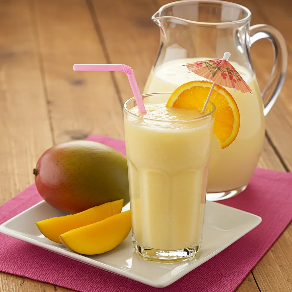 Uma vitamina cremosa e nutritiva, perfeita para um lanche da tarde ou café da manhã. A combinação de manga, mel e extrato de soja com sabor de laranja proporciona uma explosão de sabor e energia.