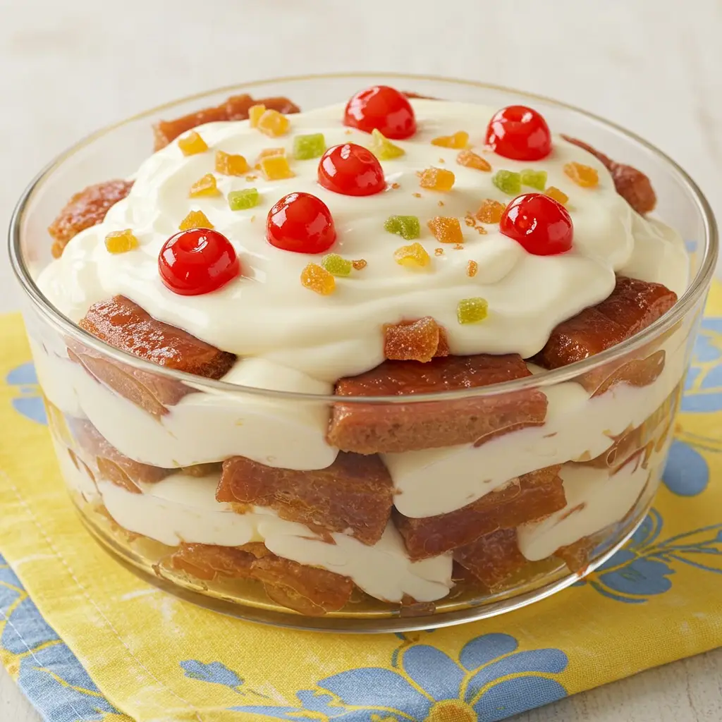 Uma releitura brasileira da clássica Zuppa Inglese, com biscoitos Champagne, frutas cristalizadas e um delicioso creme de baunilha. Uma sobremesa sofisticada e perfeita para encantar seus convidados.